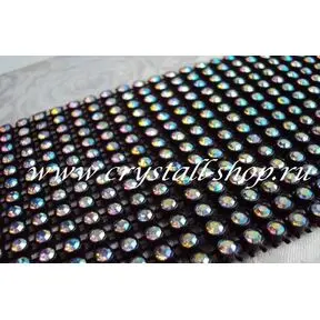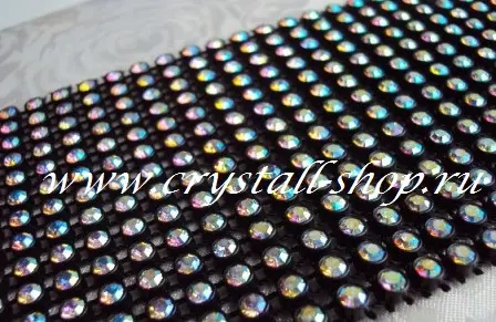Стразовое полотно в черном пластике с бесцветными хрустальными кристаллами, Полотно в ширину 11 см и 24 ряда, искрится нереально, не цепляется, можно проявить фантазию, вырезать из него разные нашивные элементы - ромбы к примеру, или выстригать из него оправу в несколько рядов для квадратных камней, можно разрезать на ряды, тогда из одного метра у вас получится 24 ярда качественной, стеклянной, сияющей ленты, полного аналога сваровски, но по цене в разы дешевле.