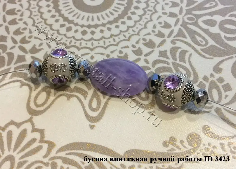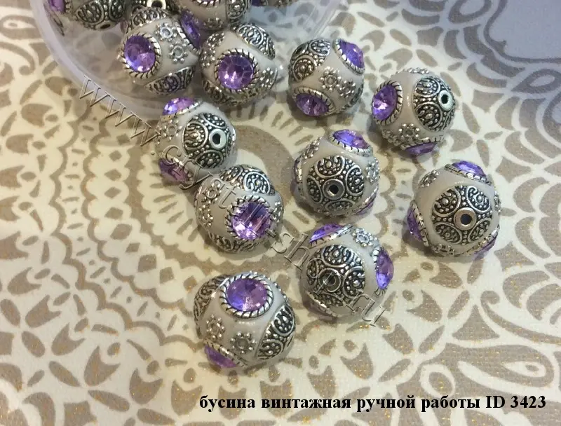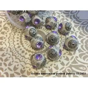 > Винтажная бусина из Индонезии, белый-серебро-сиреневые стразы, 15мм