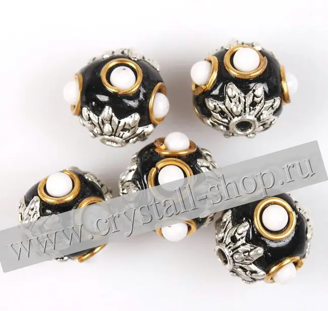 > Винтажная бусина из Индонезии, черный-белый-золото-серебро 13 мм