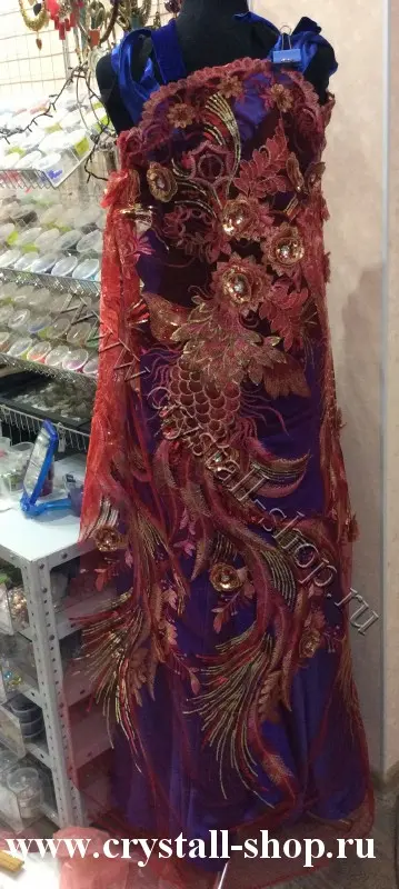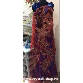 Элемент на сетке, Рыбка 130*30 красная + золото, пайетки, цветы 3Д, вышивка метализированной нитью, стразы, гладь