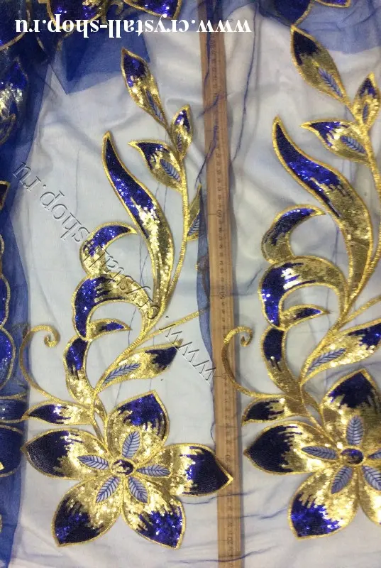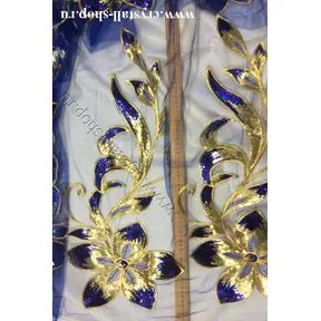 Элемент на сетке, Цветок с веточкой, 63*28 синий+золото, размер цветка 28*28 пайетки, гладь