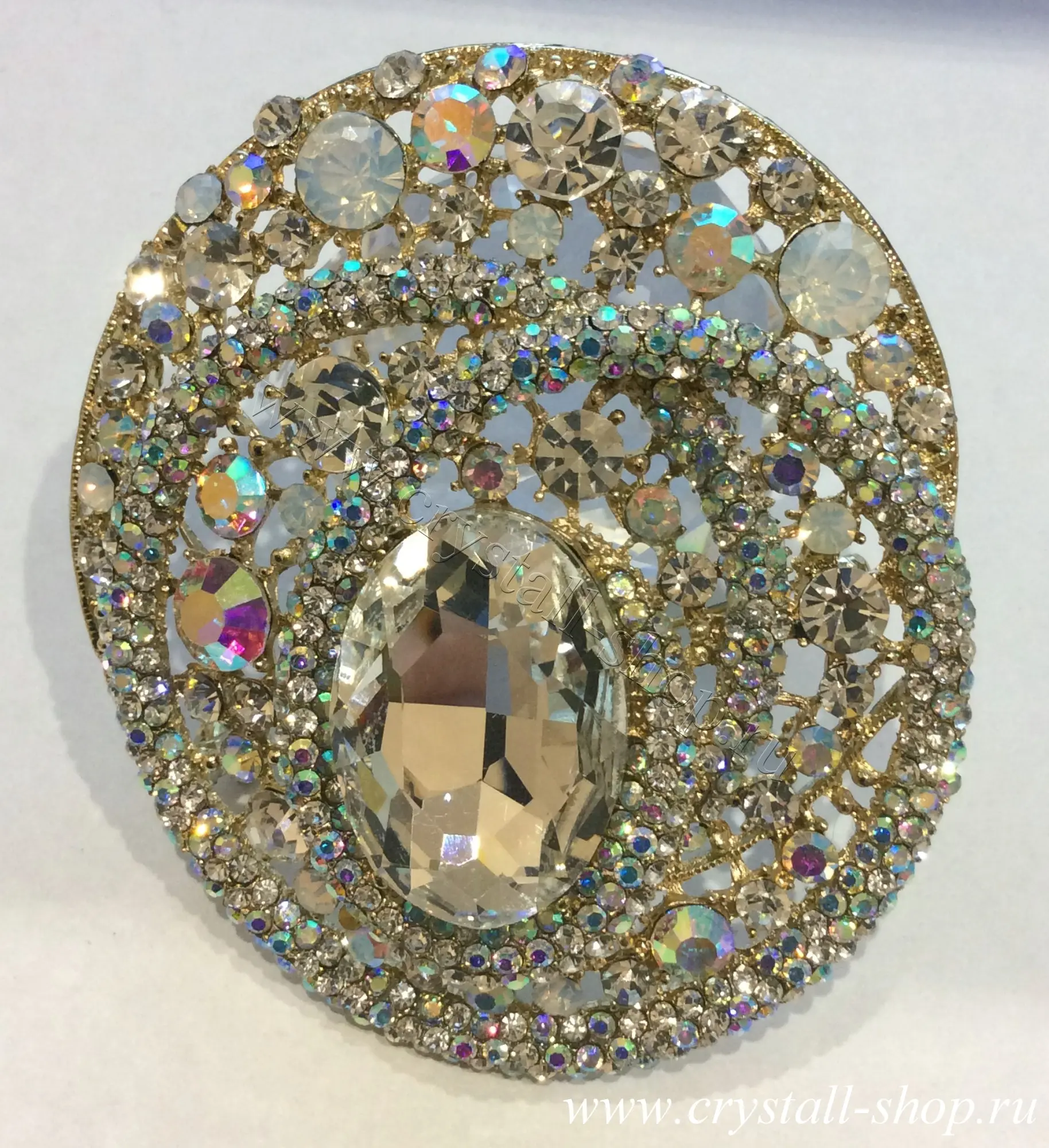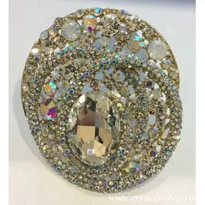Брошь витой овал, метал серебро, кристаллы стекло прозрачные, АВ и вайт опал