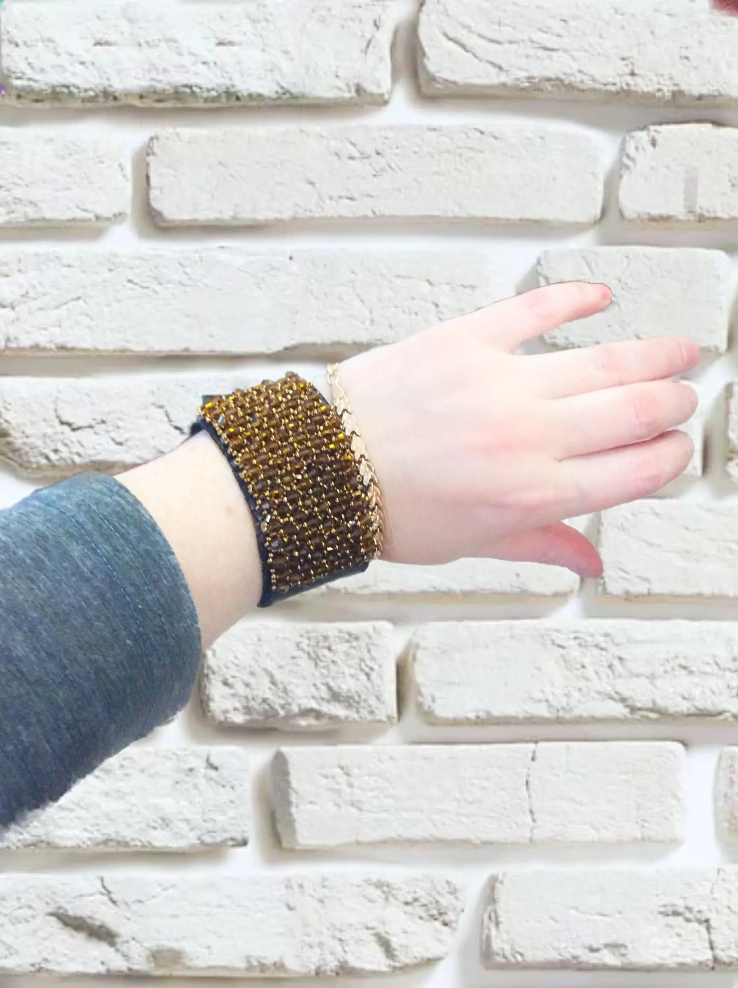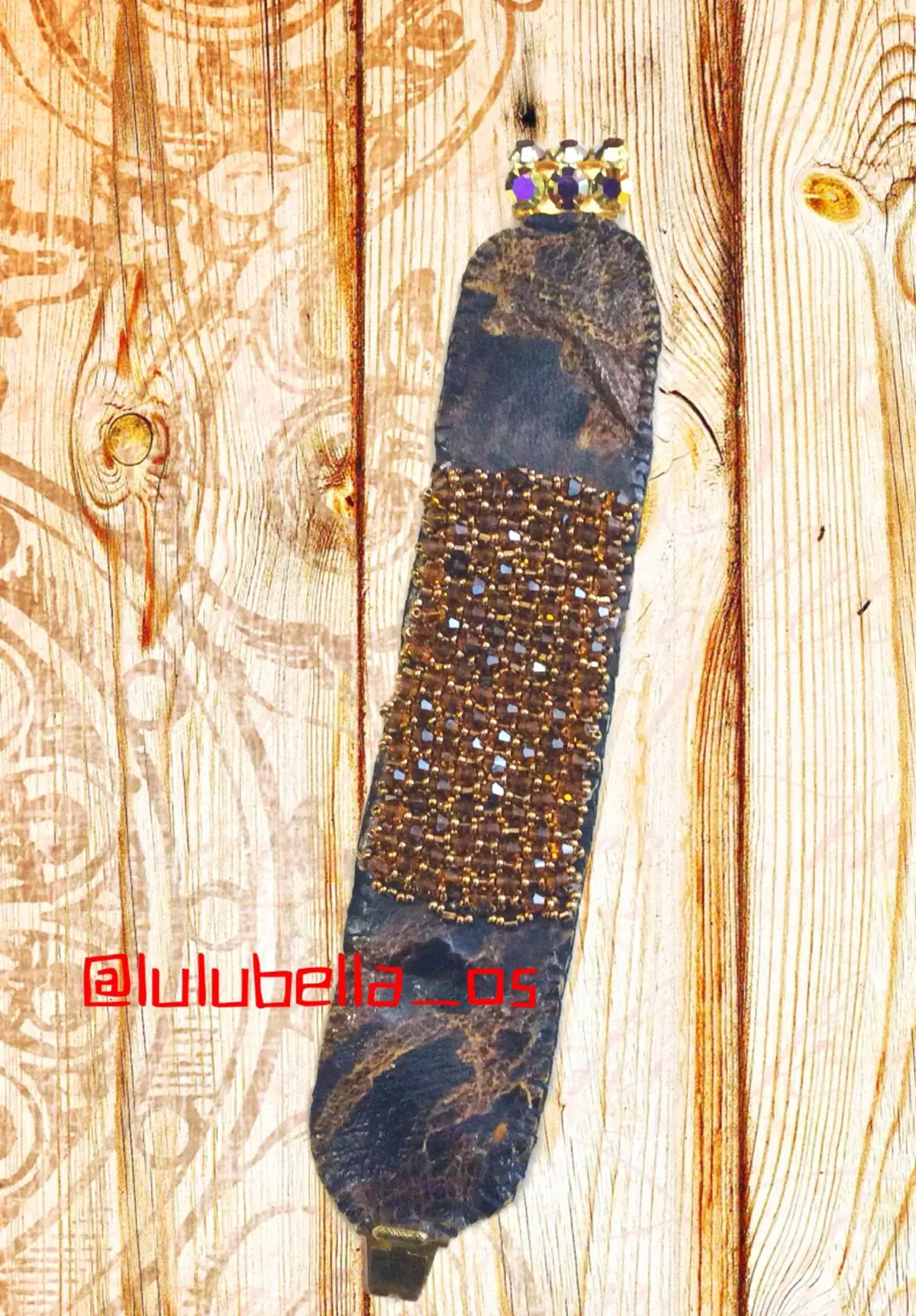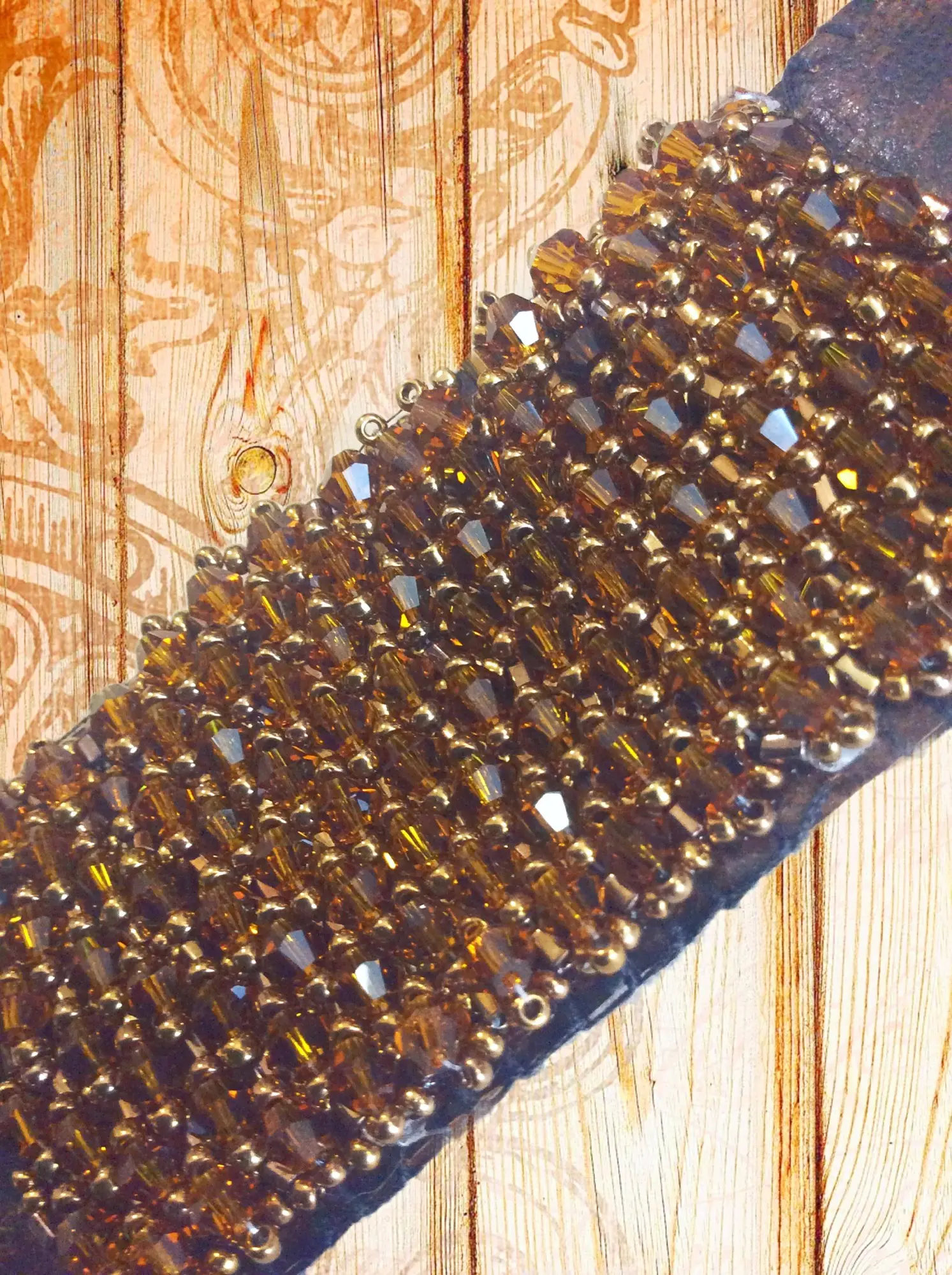 Сочетание натуральной кожи и хрустальных искрящихся биконусов смотрится оригинально и дорого, вместе с тем не обязывает к определенному стилю. Этот браслет я смогла бы надеть и с джинсами и с вечерним платьем. Шоколадный с золотистым отливом цвет материалов отлично сочетается с золотыми украшениями. В браслете использована дорогая застёжка с кристаллами сваровски.